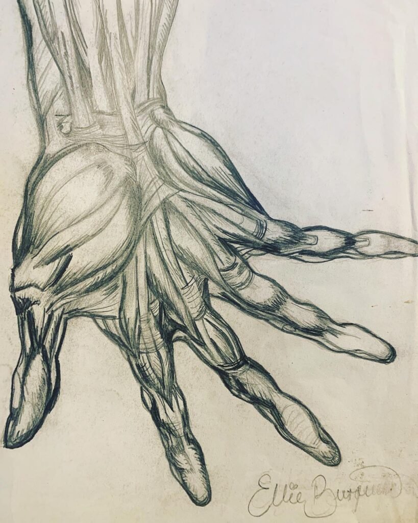 From an early age, Ellie Burgueno demonstrated a natural artistic talent, with the ability to intuitively draw and paint without formal training. Her creative abilities were recognized early on, earning her statewide drawing and painting awards beginning in third grade and continuing throughout her freshman year of high school and college.
